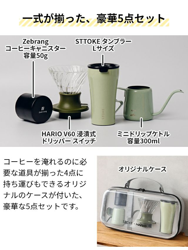 他の画像を見る STTOKE×HARIOが夢のコラボ!ハンドドリップ初心者でも、簡単に本格ドリップコーヒーが楽しめる5点セット。まとめて持ち運べる専用ケース付きで、どこでも至高の一杯に。 ストーク ハリオ STTOKE×HARIO ドリッパーセット タンブラー マグボトル コーヒーキャニスター ドリップケトル ドリップボット マイボトル セラミック 浸漬式 蓋付き 持ち運び こぼれない かわいい 保温 保冷 おしゃれ 二重 真空断熱 Dripper Set 当店特別価格 ¥ 14,850 税込 詳細を見る お気に入りに登録する