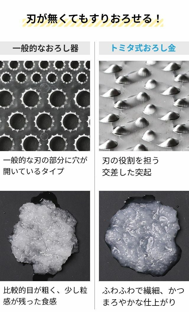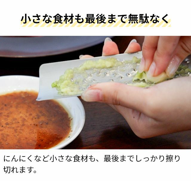 他の画像を見る 燕三条発!刃を使わないおろし金はすりおろしのときに手を切らず安心、安全。にんにくなど小さな食材も最後まで擦り切れる!洗う時のスポンジも引っかからずお手入れ簡単♪ トミタ おろし器 トミタ式おろし金 TMO-001 チーズグレーター おろしがね グレーター 生わさび しょうが ステンレス 長芋 日本製 にんにく チーズ削り 山芋 大根おろし ヒルナンデス 小 洗いやすい 安全 燕三条 グッドデザイン ◆メール便配送◆ 当店特別価格 ¥ 3,960 税込 詳細を見る お気に入りに登録する