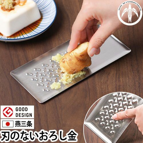 燕三条発!50年以上の歴史を持つ金属加工会社トミタが作る、刃を使わない「トミタ式おろし金」。刃がないからすりおろしのときに手を切らず安心、安全。にんにくなど小さな食材も最後まで擦り切れて、目詰まりをとるスクレーパーも必要ありません。洗う時のスポンジも引っかからずお手入れ簡単♪仕上がりはふわふわ食感。おろしたての香りと味わいを気軽に楽しめます。
