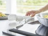 先端が浮くので、キッチン台の上に直置きにならず衛生的。調理中もスタンドいらずの省スペース設計です。