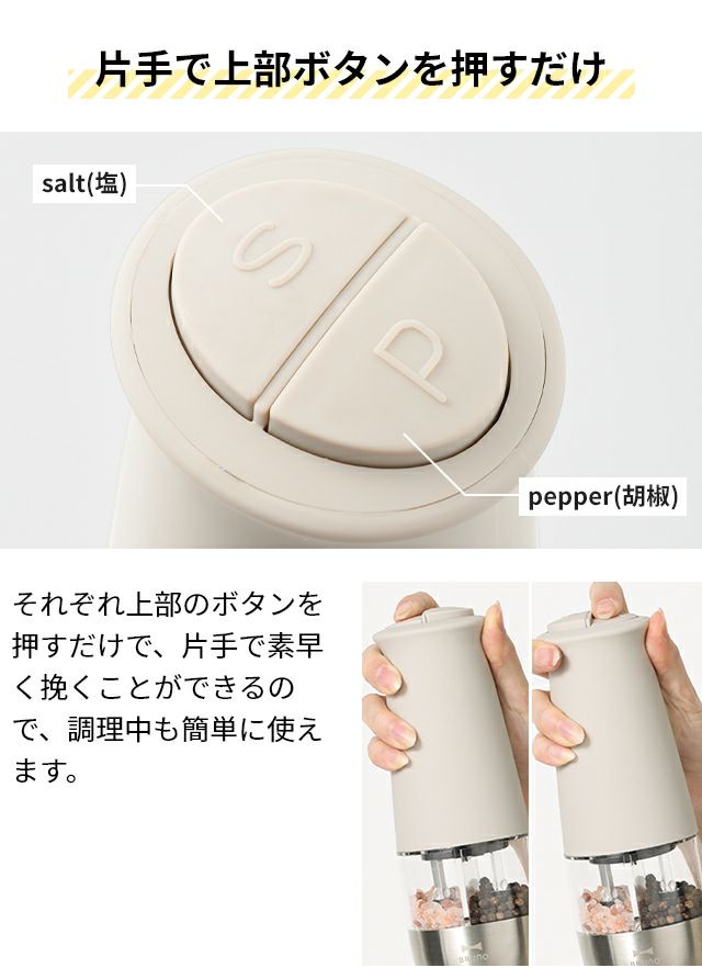 他の画像を見る スパイスの挽きたての香りが楽しめ、料理がグッと美味しくなる電動ペッパーミルが1台2役に!2種類のスパイスを入れることができるので、持ち替えいらずでとっても便利。 ブルーノ 【豪華特典付き】 ペッパーミル ダブルオートスパイスミル BHK298 電動ミル ソルトミル ソルト&ペッパー 電動 錆びない おしゃれ かわいい 片手 粗さ調節 あらびき 岩塩 粗塩 胡椒 2種類 自動 おすすめ ワンハンド ワンプッシュ BRUNO 当店特別価格 ¥ 3,850 税込 在庫切れ 詳細を見る お気に入りに登録する