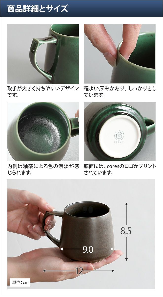 他の画像を見る 温かみのある色合いと質感が魅力的なマグカップ。飲んだ瞬間にアロマが鼻を抜けていく特別な設計。220mlの飲み切りサイズで、エスプレッソ、粉末スープ、ゲスト用に。 コレス マグカップ キキマグミニ C812 コーヒーカップ ティーカップ 磁器 美濃焼 カップ コップ 陶磁器 スープマグ おしゃれ 小さめ フリーカップ 食洗機対応 電子レンジok 香りを楽しむ 美濃焼 日本製 オシャレ 小さめ 香りを楽しむ cores 当店特別価格 ¥ 2,200 税込 詳細を見る お気に入りに登録する
