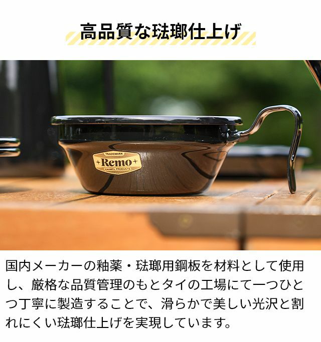 他の画像を見る 1947年創業の琺瑯専門メーカー富士ホーロー株式会社が作った、高品質な琺瑯製シェラカップ。おしゃれさとアウトドアシーンでの使用を想定した機能性を両立しています。 レモ Remo 12cm シェラカップ マグカップ スープカップ ティーカップ 使いやすい 汚れにくい 丸洗い 琺瑯 ほうろう 黒 アウトドア キャンプ CAMP キャンプ飯 キャンプグッズ バーベキュー BBQ 富士ホーロー FUJIHORO 当店特別価格 ¥ 2,530 税込 在庫切れ 詳細を見る お気に入りに登録する