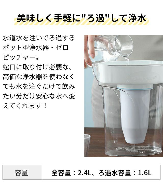 他の画像を見る トップクラスの浄水力を誇るポット型浄水器。水中の不純物除去率99.7%で、美味しく安心な純水に。 ゼロリキッド ZEROゼロピッチャー 浄水ポット ポット型浄水器 浄水器 浄水機 浄水ボトル カートリッジ付き 高機能フィルター 台所 おすすめ 大容量 フッ素除去 安全 高除去 一体型 水道水 飲む 一人暮らし 正規品 犬 猫 美味しい ZEROLIQUID 当店特別価格 ¥ 15,180 税込 詳細を見る お気に入りに登録する