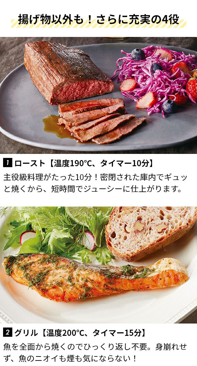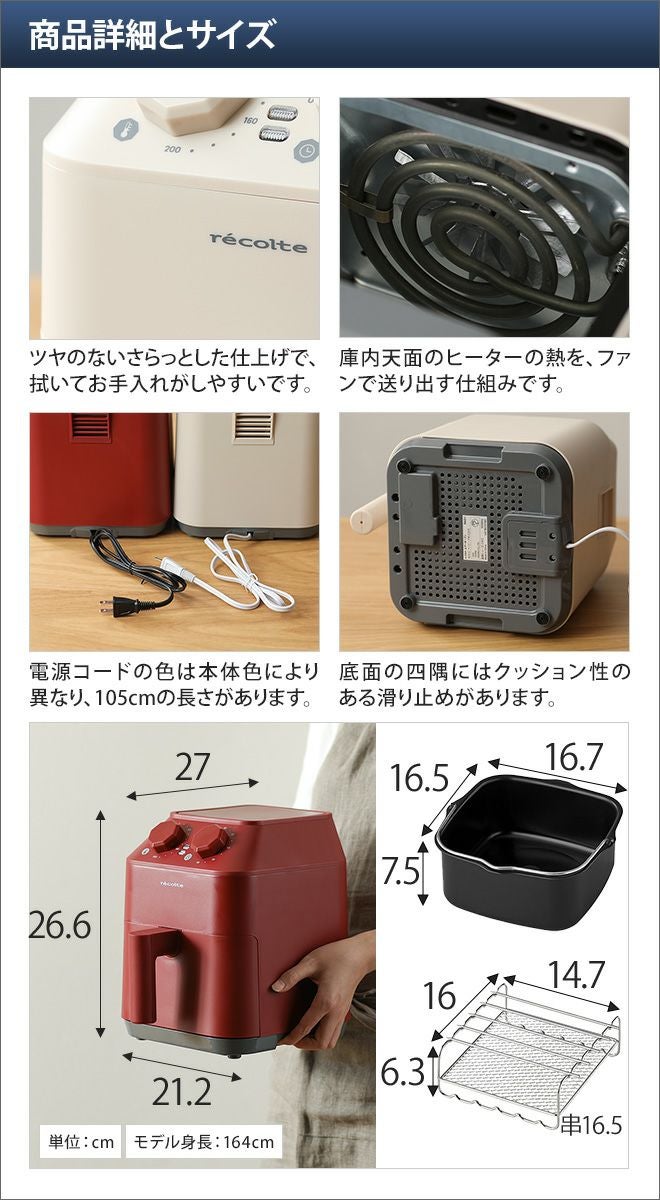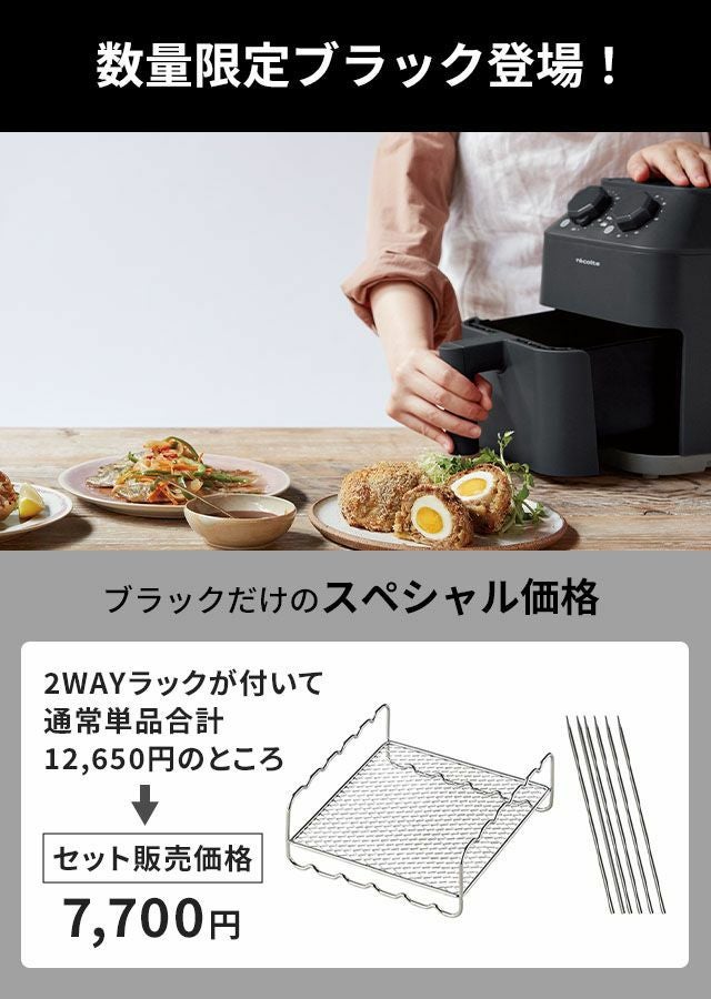 他の画像を見る 揚げ物は好きだけどカロリーが気になるし、使用済み油の処理や、飛び散り油の掃除が面倒…そんなお悩みはありませんか? エアーオーブンならそんなお悩みを解決します。 レコルト 【特典専用レシピ付き】 ノンフライヤー エアーオーブン 数量限定ブラック ツーウェイラックセット RAO-1RKST-BK ヘルシーフライヤー 電気フライヤー エアオーブン エアフライヤー ノンオイルフライヤー 家庭用 2.8L 小型 オイルフリー recolte 当店特別価格 ¥ 7,700 税込 在庫切れ 詳細を見る お気に入りに登録する