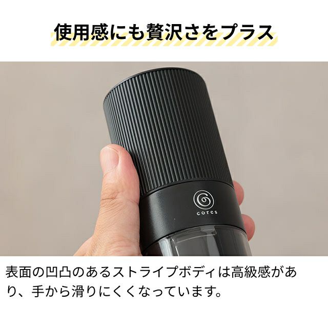 他の画像を見る キャンプなどのアウトドアでも自動で本格的な豆挽きができる!挽きムラを抑えるコーン式ミルを使用した、コンパクトコーヒーグラインダー。 コレス 【選べる2大特典】 コーヒーミル 電動 ポータブルコーヒーグラインダー C351 コーヒーグラインダー おしゃれ 自動 コードレス ポータブル コンパクト アウトドア キャンプ 持ち運び 充電式 コーヒー コーヒー豆 珈琲 ミル コーン式 粗挽き 中挽き 極細挽き cores 当店特別価格 ¥ 17,600 税込 詳細を見る お気に入りに登録する