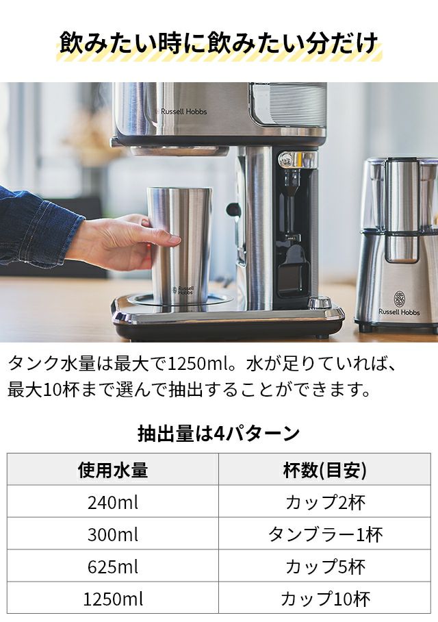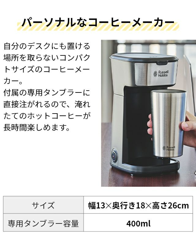 他の画像を見る 自分のデスクにも置ける場所を取らないコンパクトサイズのコーヒーメーカー。付属の専用タンブラーに直接注がれるので、淹れたてのホットコーヒーが長時間楽しめます。 ラッセルホブス 【選べる豪華特典】 コーヒーメーカー タンブラードリップ 8010JP コンパクト 小さい 一人暮らし 1人用 ドリップ ミルなし お手入れ簡単 自動オフ ステンレス タンブラー 持ち運び 蓋付き 保温 保冷 おしゃれ おすすめ Russell Hobbs 当店特別価格 ¥ 5,500 税込 詳細を見る お気に入りに登録する