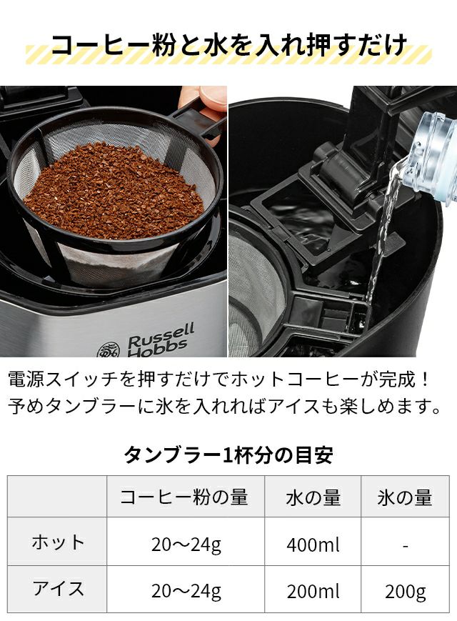 他の画像を見る 手頃な5カップサイズはそのままに、従来品よりも抽出温度が5%アップしたドリップ式コーヒーメーカー。珈琲の油分まで味わえるフィルターとの相乗効果で、さらに美味しく。 ラッセルホブス 【選べる豪華特典】 コーヒーメーカー ベーシックドリップ 7620JP コーヒーマシン ドリップ式 おしゃれ ガラス容器 コンパクト 2カップ 3カップ 5杯 洗いやすい 粉 タイマー付き 保温機能付 自動電源オフ Russell Hobbs 当店特別価格 ¥ 8,800 税込 詳細を見る お気に入りに登録する