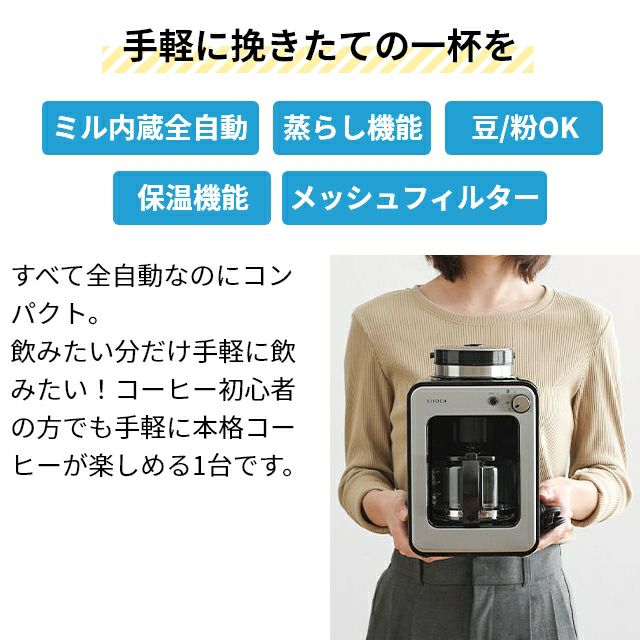他の画像を見る コーヒー豆をミルで挽く、お湯を沸かす、ドリップして淹れる、すべてを自動で行ってくれるコーヒーメーカー。おうちでも手軽に挽きたての美味しいコーヒーが楽しめます。 シロカ 【選べる豪華特典】 全自動コーヒーメーカー SC-A211 ミル付き 家庭用 保温機能付 洗浄しやすい 洗いやすい 洗える お手入れ簡単 温度 一人暮らし ペーパーレス 豆粉 両方 コンパクト 計量スプーン付き シンプル 小型 siroca 当店特別価格 ¥ 12,980 税込 詳細を見る お気に入りに登録する