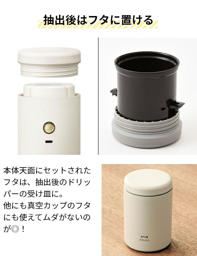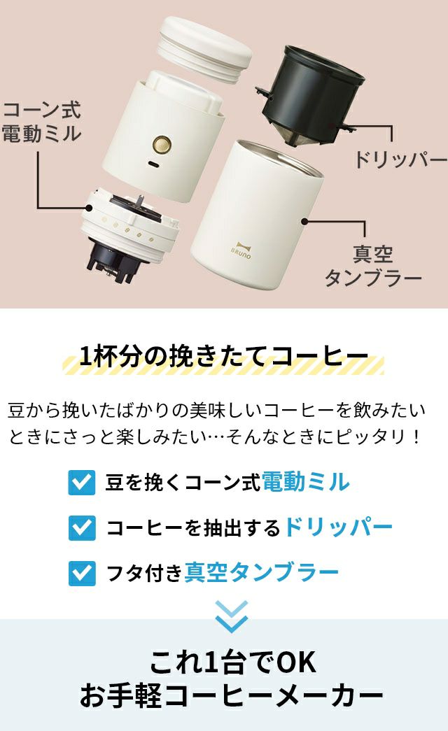 他の画像を見る 電動ミル・ドリッパー・タンブラーがこれ1台で。1杯だけコーヒーを楽しみたい一人用のコンパクトなコーヒーメーカーです。 ブルーノ 【選べる豪華特典】 パーソナル電動ミルコーヒーメーカー BHK301 ミル付き コードレス コンパクト おしゃれ 洗浄しやすい 一人用 保温保冷タンブラー付き ドリップ 1人用 1杯 洗いやすい 洗える お手入れ簡単 家庭用 小型 手動 BRUNO 当店特別価格 ¥ 6,600 税込 在庫切れ 詳細を見る お気に入りに登録する