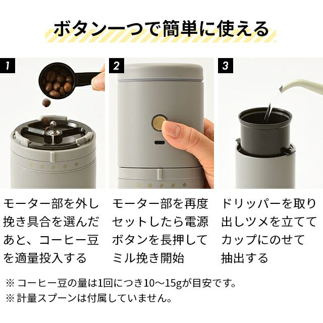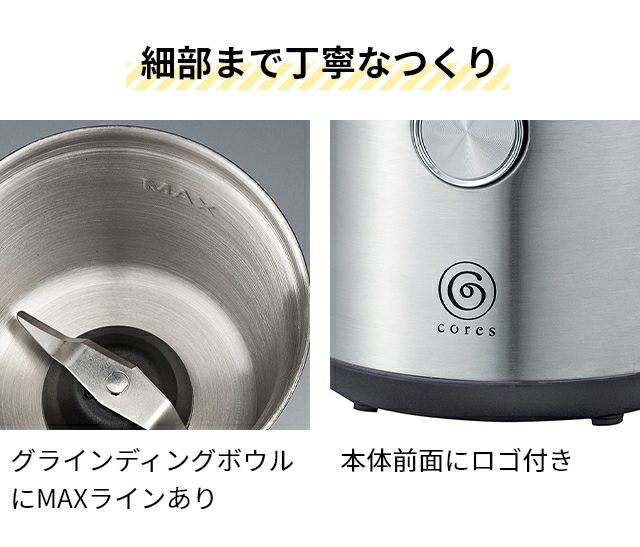 他の画像を見る スイッチ1つの簡単操作でコーヒー初心者でも使いやすい!コンパクトなのにハイパワーで数杯分の中挽きも10秒足らずで完成。本体分離型のボウルと蓋で粉の飛び散りを防止。 コレス コーヒーミル ブレードコーヒーグラインダー C340 コーヒーグラインダー 電動コーヒーミル 電動ミル 珈琲ミル 電動 ブラシ コーヒー おしゃれ 小型 コンパクト 初心者 クラシック 掃除しやすい 中挽き 手入れしやすい 手軽 飛び散らない cores 当店特別価格 ¥ 6,600 税込 在庫切れ 詳細を見る お気に入りに登録する
