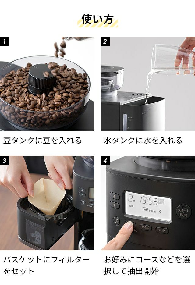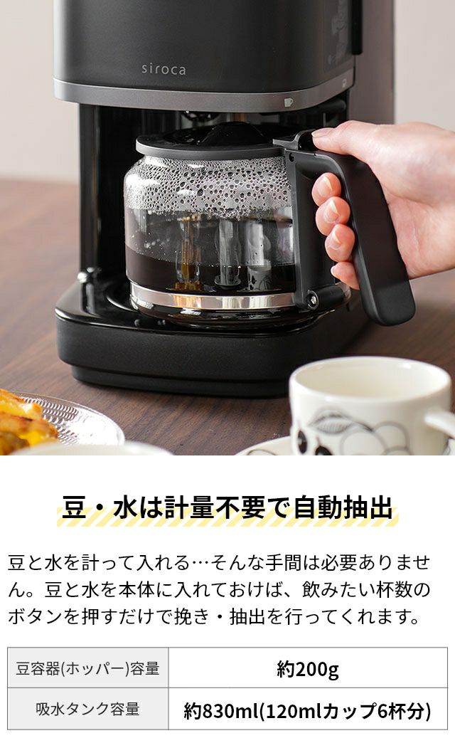 他の画像を見る コーヒー豆をミルで挽く、お湯を沸かす、ドリップして淹れる、すべてを自動で行ってくれるコーヒーメーカー。おうちでも手軽に挽きたての美味しいコーヒーが楽しめます。 シロカ 【選べる2大特典】 全自動コーヒーメーカー カフェばこ SC-A352 ミル付き 全自動 タイマー機能 おしゃれ 保温機能付き ドリップポッド ホット アイス ガラスサーバー ガラス容器 着脱給水タンク お手入れ簡単 4杯分 コンパクト 小さめ siroca 当店特別価格 ¥ 18,700 税込 詳細を見る お気に入りに登録する