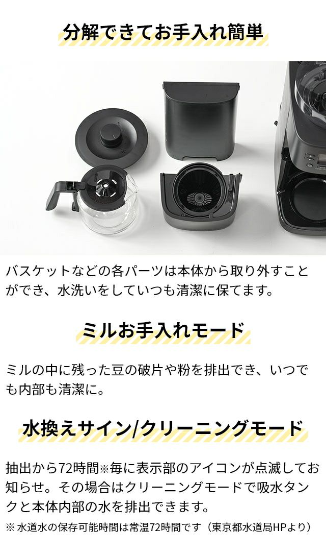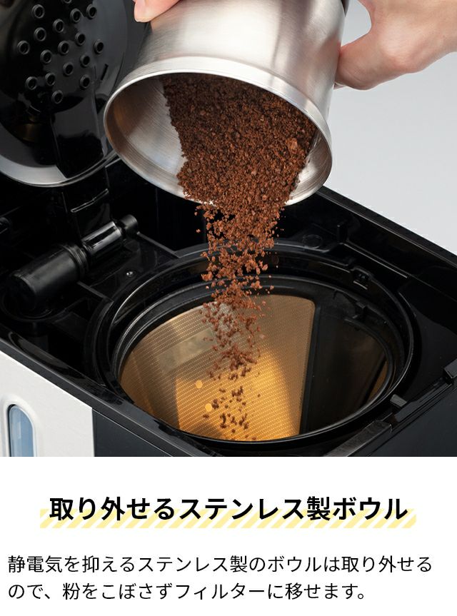 他の画像を見る 高精度のコーン式ミルを採用し、豆の挽きムラを抑え、雑味の少ないコーヒーを淹れられます。豆・水の計量不要、タイマーつきで忙しい朝も楽! シロカ 【選べる2大特典】 全自動コーヒーメーカー カフェばこPRO CM-6C261 ミル付き 全自動 タイマー機能 おしゃれ 保温機能付き ドリップポッド アイス ステンレスサーバー 着脱給水タンク お手入れ簡単 ガラス容器 直接マグカップ 6杯 siroca 当店特別価格 ¥ 29,700 税込 在庫切れ 詳細を見る お気に入りに登録する