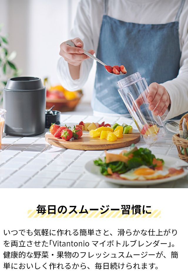 いつでも気軽に作れる簡単さと、滑らかな仕上がりを両立させたブレンダー。健康的な野菜・果物のフレッシュスムージーが、簡単においしく作れるから、毎日続けられます。 ビタントニオ マイボトルブレンダー VBL-70 ミキサー スリム 小型 コンパクト 氷 砕ける 氷も砕ける 洗いやすい お手入れ簡単 ボトル 持ち運び おすすめ おしゃれ シンプル 朝食 野菜 果物 フルーツ スムージー Vitantonio MY BOTTLE BLENDER