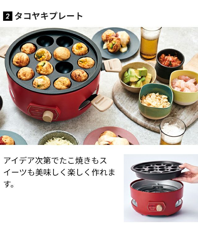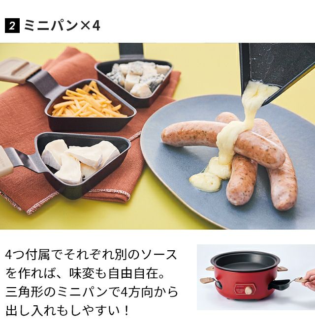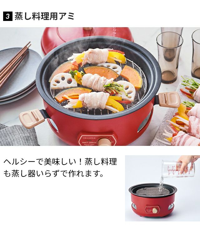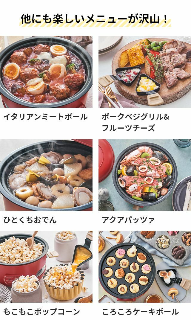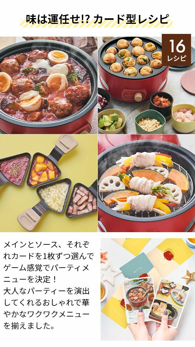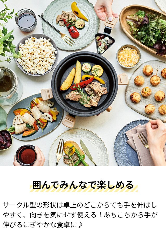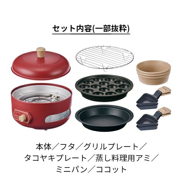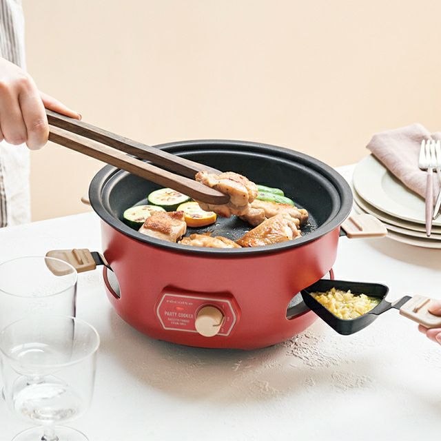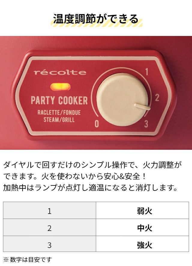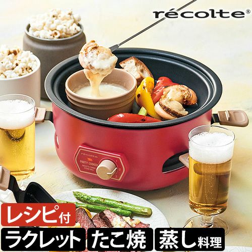 ラクレットやフォンデュに加え、たこ焼きや蒸し料理、ポップコーンも気軽に楽しめるマルチな卓上調理器。下段に4つのミニパンがセットでき、ソースが同時に調理可能です。 レコルト 【2大特典】 ラクレットグリル パーティークッカー RRF-3 卓上グリル 電気グリル グリル鍋 円 コンパクト おしゃれ 小型 チーズフォンデュ レシピ 野菜 ヒーター 下段 上段 蒸し野菜 ポップコーン たこ焼き recolte Party Cooker
