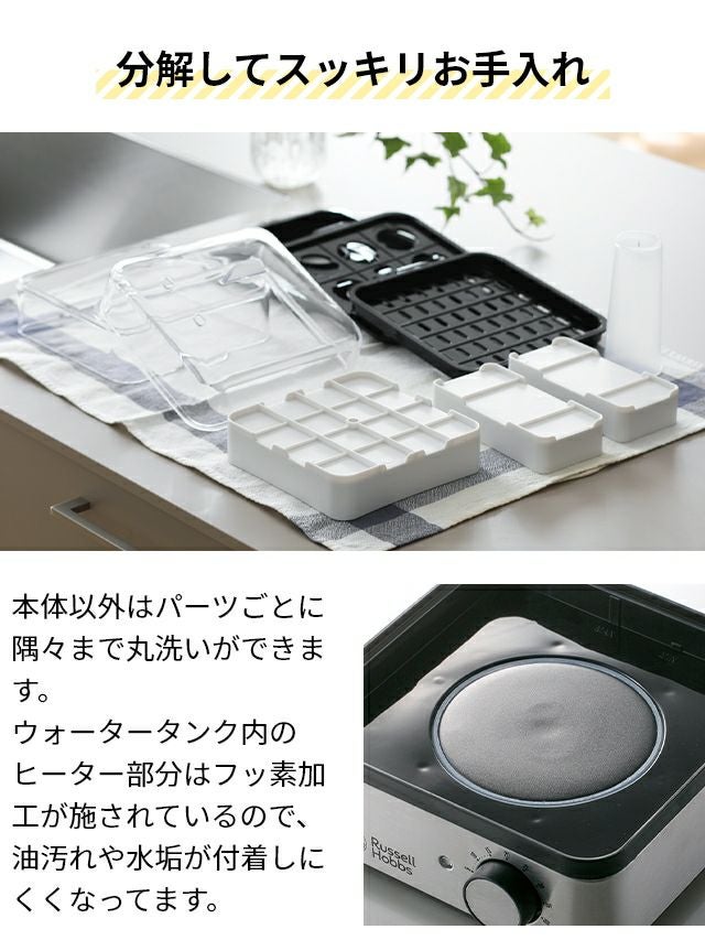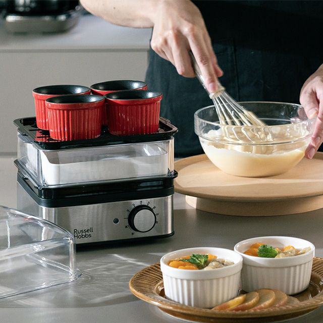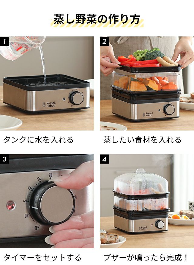 手間のかかる蒸し料理を簡単・手軽に作れる電気蒸し器。水とタイマーをセットするだけ!様々な蒸し料理・ふっくらご飯・プリンなどのデザート作りをお試しいただけます。 【選べる豪華特典】 ラッセルホブス 蒸し器 電気 ミニスチーマー 7910JP フードスチーマー 料理 洗いやすい オシャレ 小型 シュウマイ 炊飯器 茶碗蒸し 肉まん 野菜 ゆで卵 温野菜 じゃがいも ご飯 四角 コンパクト ステンレス 2段 Russell Hobbs