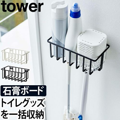 「tower ウォールトイレ用品収納ラック」は、壁面に設置して、消臭剤やトイレ洗剤を浮かせて収納できるラック。スプレーボトルやクリーナーシートなどを、省スペースに取出しやすく収納できます。トイレブラシやフロアワイパーが掛けられるフック付きで、掃除用品もひとまとめに!