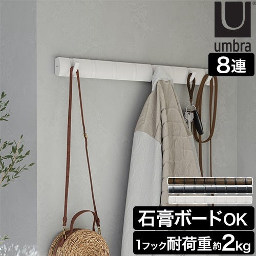 お好きな高さに壁面設置できるコートハンガー、「umbra フリップフック 8連」。ジャケットやバッグを掛けるのはもちろん、よく使う帽子や傘を掛けるのにもぴったり。1フックにつき耐荷重約2kgのしっかりとした作りで、冬物コートも安心して掛けられます。フックは折りたたみ式なので、使わないときはすっきりとした佇まい。玄関や廊下をさりげなくおしゃれに演出してくれます。
