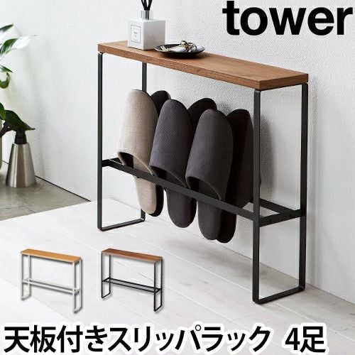 スリッパを美しく収納!スリムな形状のスリッパラックは色々ありますが、天板が付いているのは珍しい!まるでコンソールテーブルのようなお洒落な雰囲気になり、生活感がグッと減りました。鍵やアロマディフューザー、小さな観葉植物を置くとより素敵な空間になりそうですね♪天板は側面までしっかり木目デザインが施されているので、高級感があります。天板の下はフレームだけで構成されているので、圧迫感もなくスッキリとしています。ボックス型のスリッパラックやバスケットとは違い、ホコリが溜まらないからお手入れも楽ですね。脚の底面には滑り止めが付いているので、フローリングの上でもキズが付きにくいから安心です。