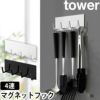 冷蔵庫の扉に、マグネットでピタッとくっつけて使える「tower マグネットキッチンツールフック 4連」。マグネットだからお好みの場所や高さに簡単に設置できます!タワーシリーズらしいシンプルでおしゃれなデザインが、ごちゃつきがちな収納場所をすっきりと見せてくれます。