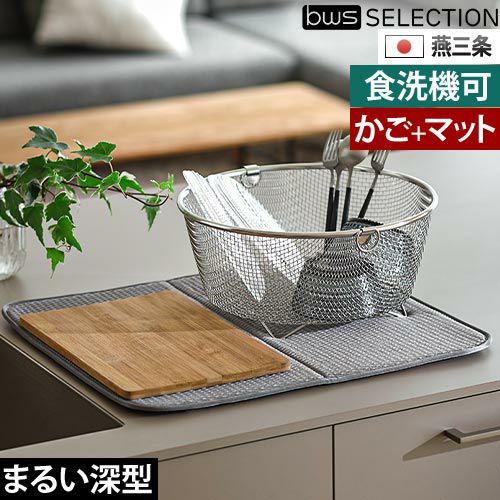「bws SELECTION すっきり暮らすシリーズ」水切りかごまるい深型と、組み合わせて使える水切りマットのセット。