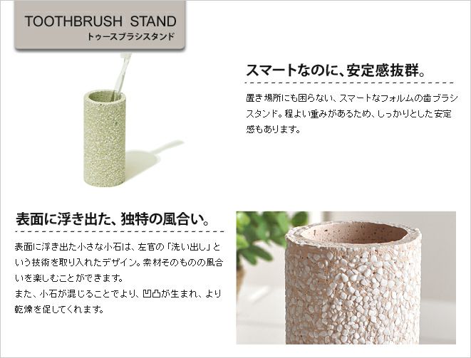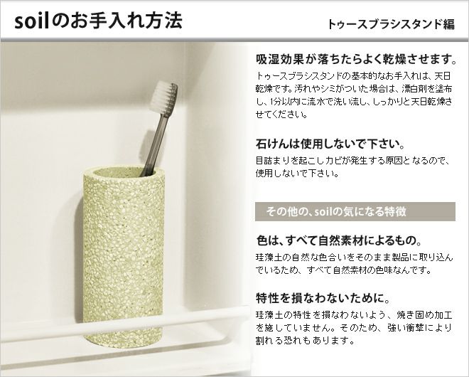 他の画像を見る 吸水性の高い珪藻土で作られた歯ブラシスタンド。水気をカラッと吸収し、心地よく歯ブラシを収納することが出来ます。日本製。 soil トゥースブラシスタンド 日本製 当店特別価格 ¥ 4,950 税込 在庫切れ 詳細を見る お気に入りに登録する