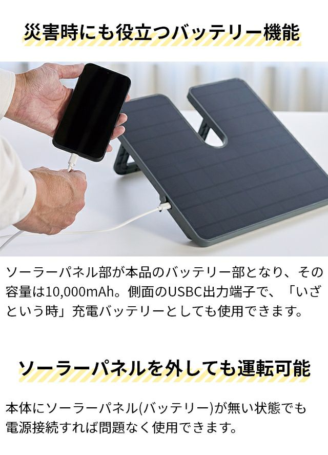 他の画像を見る ソーラーパネル搭載で発電から消費まで一台で完結するコードレス扇風機。モバイルバッテリーとしても使え、災害用としても活躍。風量8段階など、扇風機としての機能性も◎ 【選べる豪華特典】 扇風機 コードレス ソーラーパワーリビングファン AEF-900R コードレス扇風機 ソーラー 防災グッズ 防災 非常用 停電 モバイルバッテリー 充電器 USB 充電 充電式 静か 静音 首振り リモコン おしゃれ ENEMATE by APIX エネメイト アピックス 当店特別価格 ¥ 35,200 税込 詳細を見る お気に入りに登録する