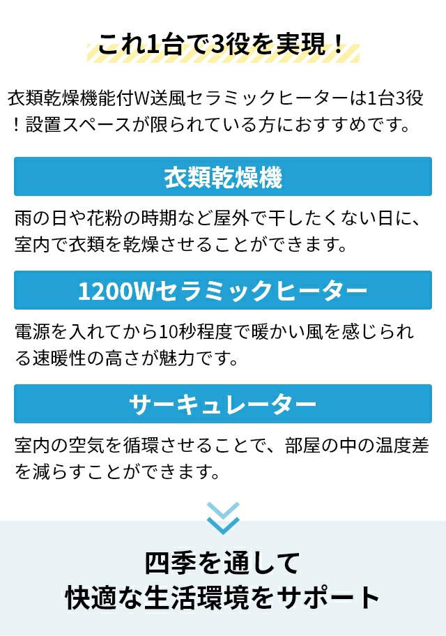 他の画像を見る 衣類乾燥機/乾燥機/セラミックヒーター/ヒーター/サーキュレーター/小型/速暖1200w/電気/足元/乾燥/部屋干し/暖房/おしゃれ/温風/衣類/エコモード/一人暮らし/スリーアップ スリーアップ 衣類乾燥機 衣類乾燥機能付 W送風セラミックヒーター ドライヒート CD-T2274 乾燥機 セラミックヒーター ヒーター サーキュレーター 小型 速暖1200w 電気 足元 乾燥 部屋干し 暖房 おしゃれ 温風 衣類 エコモード 一人暮らし THREEUP 当店特別価格 ¥ 21,780 税込 在庫切れ 詳細を見る お気に入りに登録する