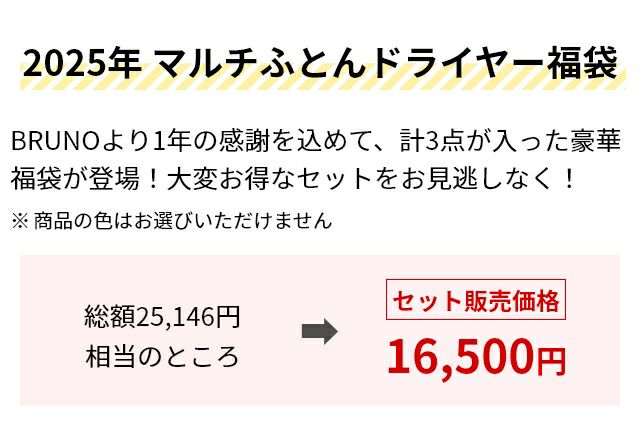 他の画像を見る BRUNOの豪華でお得な福袋!マルチふとんドライヤー、スタイリングハンディスチーマー、2WAYアイロンミトンの計3点入り。大変お得なセットをお見逃しなく! ブルーノ 福袋 2025年 マルチふとんドライヤー福袋 BOE047 BOE076 BOA141 布団乾燥機 スチーマー スチームアイロン ハッピーバッグ ラッキーバッグ お楽しみ袋 お得 コンパクト 軽量 かけたまま おしゃれ 中身が見える 羽毛布団 生活家電 靴 BRUNO 当店特別価格 ¥ 16,500 税込 在庫切れ 詳細を見る お気に入りに登録する