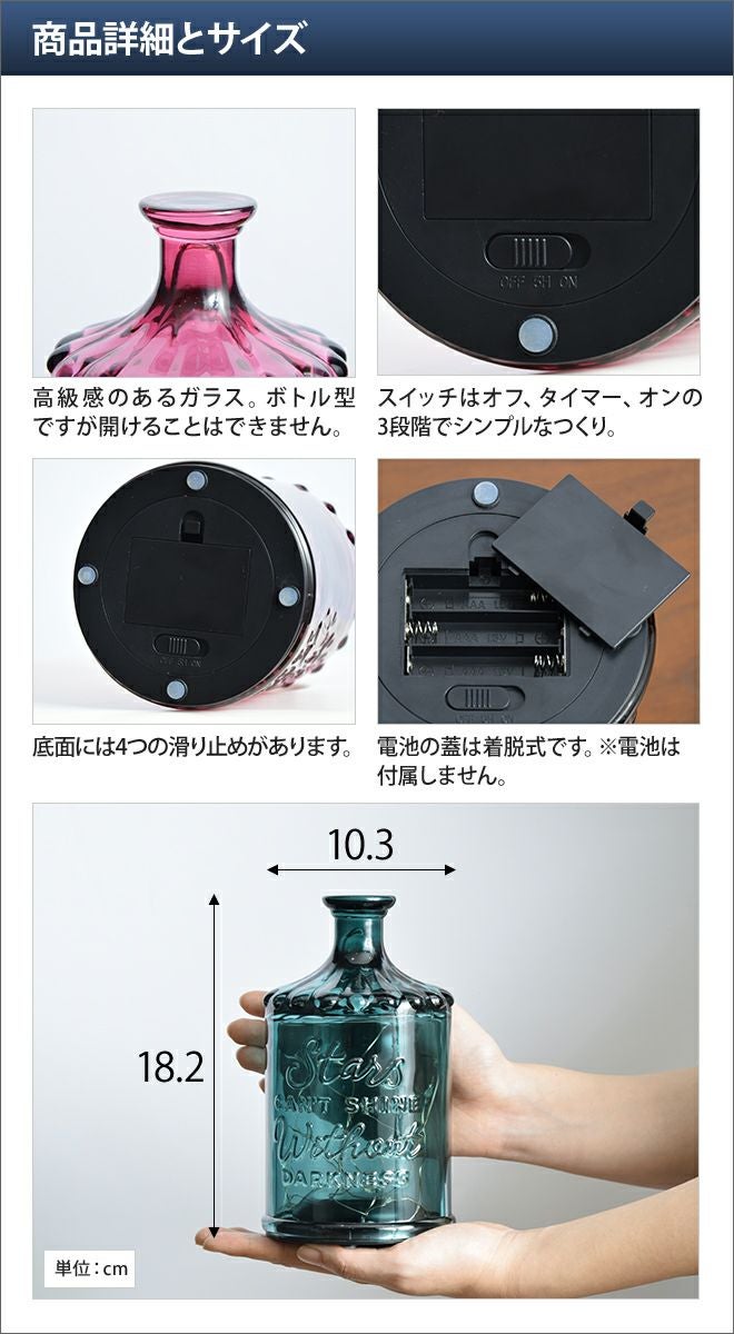 他の画像を見る ハンドメイドガラスから眩い光が漏れる存在感のあるインテリアボトルライト。 BOTTLE LIGHT DELTA 当店特別価格 ¥ 3,300 税込 在庫切れ 詳細を見る お気に入りに登録する