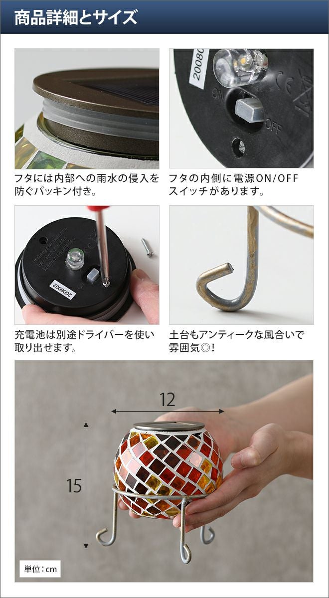 他の画像を見る モザイクガラス/キャンドルホルダー/ステンドグラス/照明/ランプ/トルコランプ/おしゃれ/可愛い/デザイン/LED/インテリア/キシマ/KISHIMA ガーデンライト ソーラー モザイクエトワル 屋外 電池式 ソーラーライト 防水 ガーデニング雑貨 アンティーク レトロ 当店特別価格 ¥ 2,343 税込 詳細を見る お気に入りに登録する