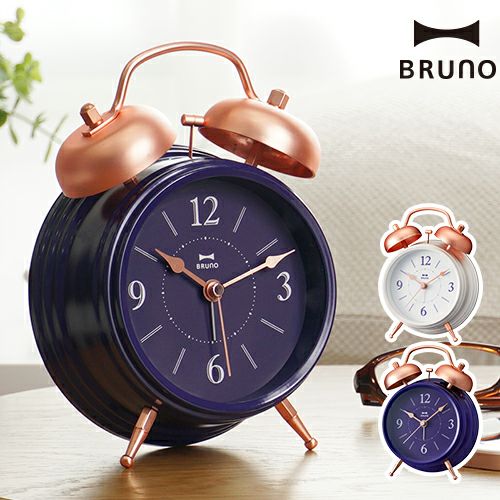 BRUNO カッパーツインベルクロックは、ネイビー、ホワイトを本体色として、銅(カッパー)の差し色を配したおしゃれで可愛いベルクロックです。