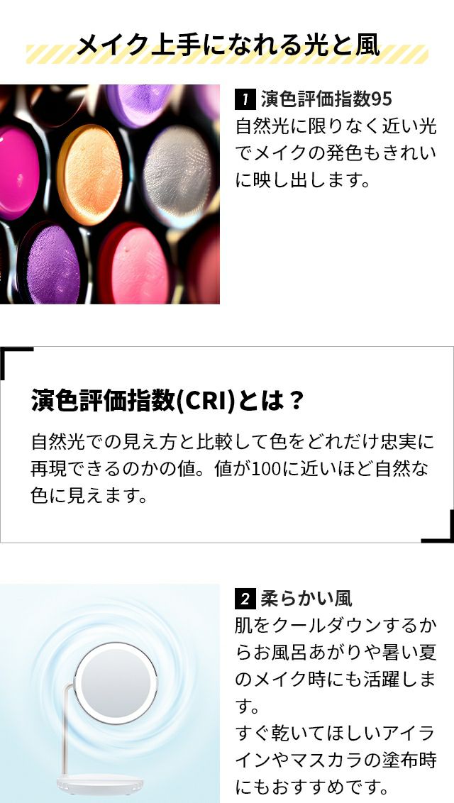 他の画像を見る 均一な明かりでメイクがしやすくなる、LED内蔵の卓上ミラーです。そよ風が出るファン内蔵。 FESTINO エアリーメイクファンミラー 当店特別価格 ¥ 4,400 税込 在庫切れ 詳細を見る お気に入りに登録する
