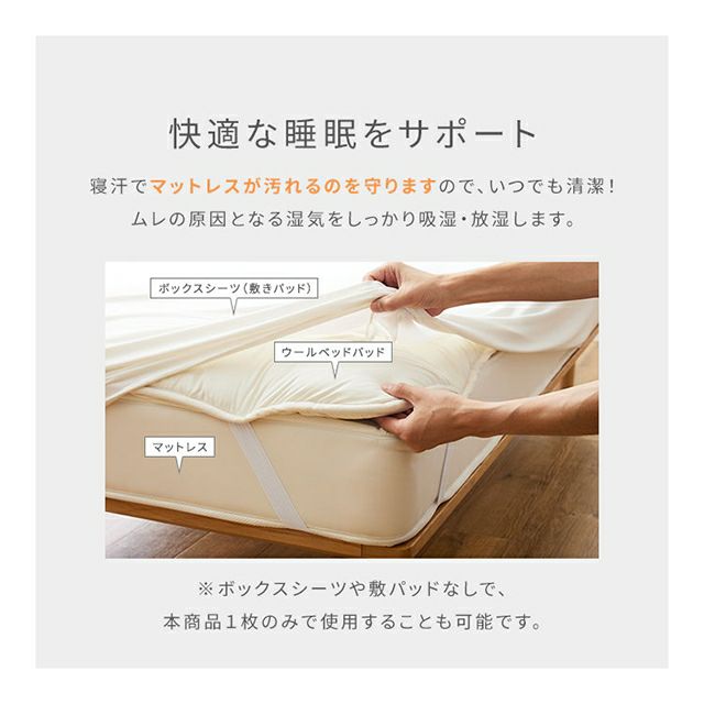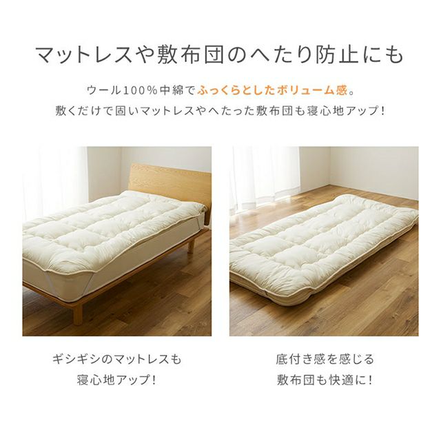 他の画像を見る 冬は暖かく夏は涼しい、洗えるウール100%のベッドパッドです。高いクッション性で寝心地アップ。ご家庭の洗濯機で丸洗いOK、マットレスを汚れから守ります。 ナイズデイ ベッドパッド Sleep Niceday フランス産ウォッシャブルウール100%使用した 増量プレミアムベッドパッド 日本製・消臭・吸湿 S 敷き布団パッド マットプロテクター シングル 羊毛100% 保温 洗える オールシーズン 厚手 Niceday 当店特別価格 ¥ 14,800 税込 詳細を見る お気に入りに登録する