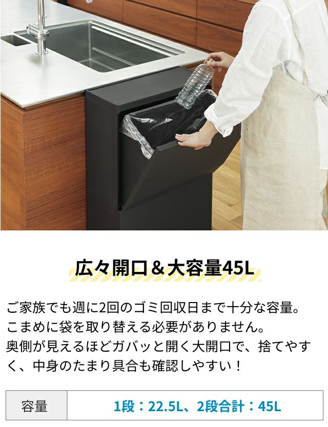 他の画像を見る 袋をかけて、フタ枠で挟むだけの最短10秒!ゴミ袋交換が簡単・素早く・きれいにできる40Lごみ箱。キッチンの隙間に置ける奥行約21?のスリム設計。キャスター付きです。 ソロウ ゴミ箱 ふた付き 通路で使える ワイドダストボックス ハンドオープン40L 蓋付きゴミ箱 くず入れ 45リットル袋 日本製 おしゃれ 分別 北欧 大容量 キャスター付き インテリア キッチン 45l袋 抗菌 シンプル 横長 横開き 横型 リビング スリム SOLOW 当店特別価格 ¥ 4,400 税込 詳細を見る お気に入りに登録する