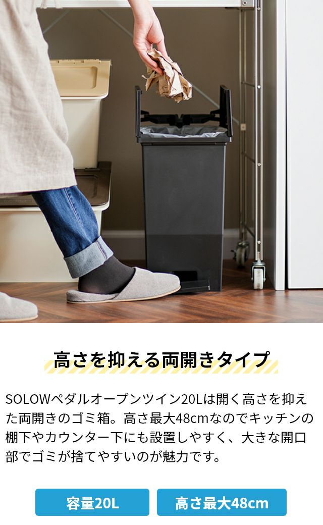 他の画像を見る 高さを抑えた両開きペダル式ゴミ箱20L ソロウ 【選べる豪華特典】 ゴミ箱 ペダル式 ペダルオープンツイン 20L GSLW0 ペダル式ゴミ箱 ゴミ箱 ダストボックス 20l 足踏み スリム 蓋付き 両開き 横開き 分別 棚下 キャスター フタ付き 日本製 バタフライ ペダル 袋止め SOLOW 当店特別価格 ¥ 3,520 税込 詳細を見る お気に入りに登録する