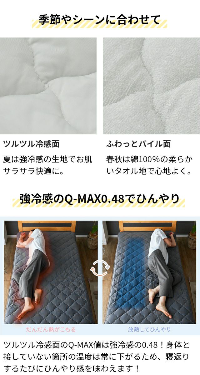 他の画像を見る ひんやりとした接触冷感生地とふんわりタオル生地が合わさったリバーシブル仕様の敷きパッドセミダブルサイズ。置くだけで、汗をかいても蒸れにくく、さらさらして涼しい♪ テイジン 敷パッド 【TEIJIN_快適清潔シリーズ】もちもちタッチの強冷感とコットンパイルのリバーシブル敷きパッド SD セミダブル ベッドパッド 敷き布団 ベッドシーツ 綿 ひんやり コットン タオル地 冷感 春夏 夏用 リバーシブル TEIJIN 当店特別価格 ¥ 4,990 税込 在庫切れ 詳細を見る お気に入りに登録する