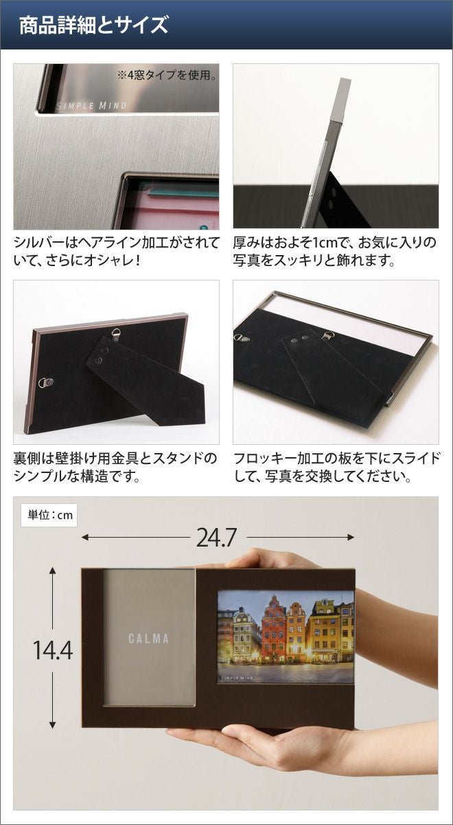 他の画像を見る シンプルながらもデザイン性がキラリと光るメタルフォトフレーム。置き掛け両用で、L判が縦横1枚ずつ飾れます。 CALMAメタルフォトフレーム 2面 当店特別価格 ¥ 1,870 税込 在庫切れ 詳細を見る お気に入りに登録する