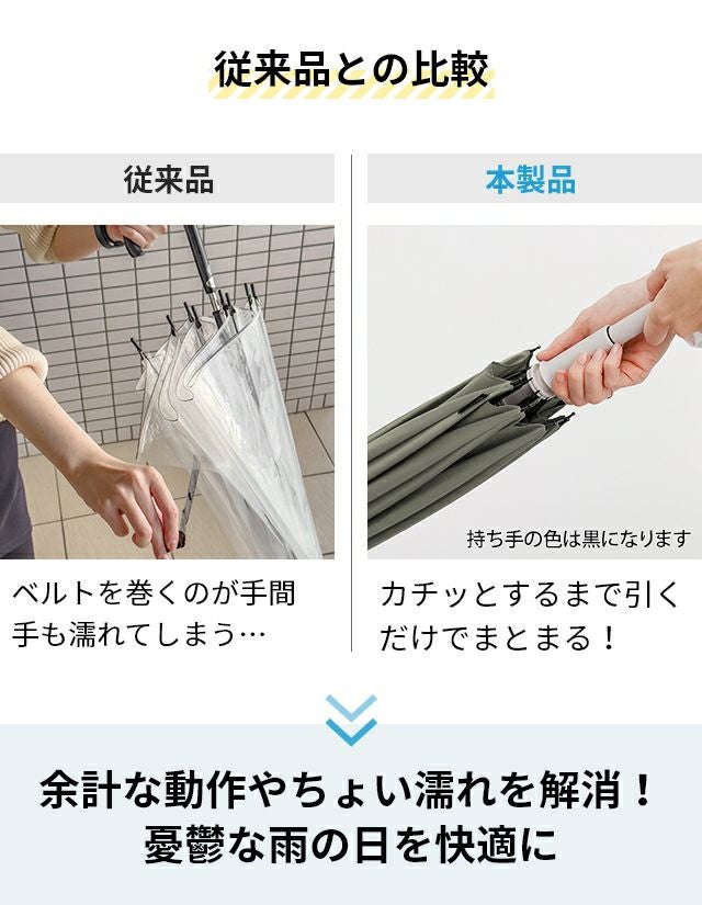 他の画像を見る ベルトのない、閉じるだけでスリムにまとまる傘です。最後に手で生地をまとめたり、ベルトで留める必要がなく、手を濡らさず、もたつく煩わしさもありません。 マーナ 【選べる2大特典】 傘 シュパット アンブレラ 58cm 雨傘 長傘 晴雨兼用 手が濡れない 畳める ベルトなし レディース メンズ 男女兼用 無地 おしゃれ かわいい シンプル 車 大人 スライド 16本骨 母の日 撥水 UVカット marna Shupatto 当店特別価格 ¥ 6,380 税込 詳細を見る お気に入りに登録する