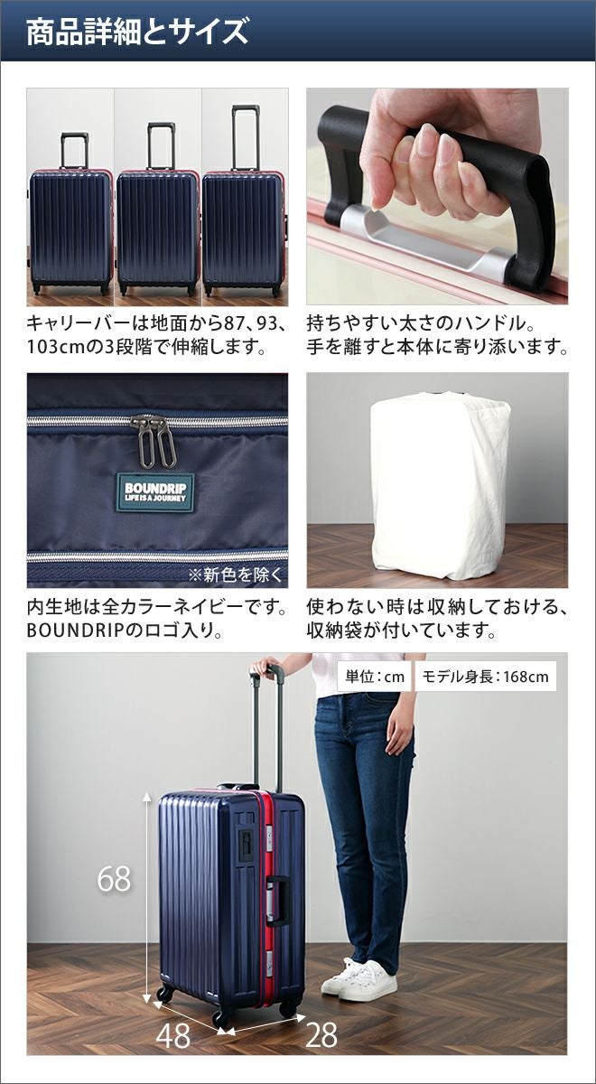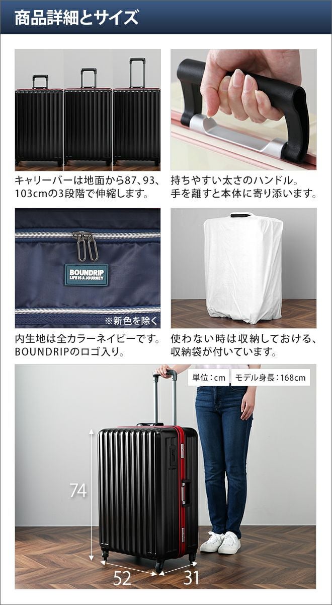 他の画像を見る スーツケース/BOUNDRIP/ハードフレームキャリー/105L/大容量/7泊以上/フレームタイプ/TSAロック/ブレーキキャスター/消音/ヒノモト/HINOMOTO/機内預入可能/旅行/バウンドリップ/おしゃれ BOUNDRIP ハードフレームキャリー 105L 当店特別価格 ¥ 22,880 税込 在庫切れ 詳細を見る お気に入りに登録する