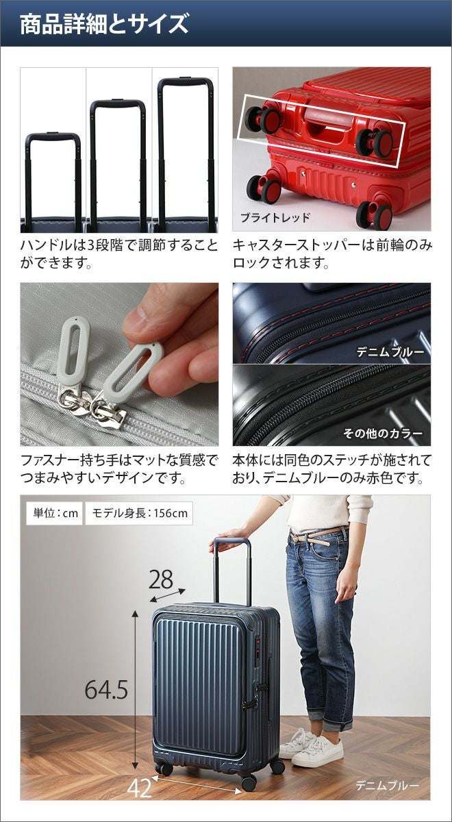 他の画像を見る おしゃれな大容量のスーツケース。フロントオープンで13インチのPCなど荷物がたっぷり入り、360度に動く静音のキャスター+軽量だから移動も楽。キャスターロック付。 イノベーター 【選べる豪華特典】 スーツケース ハードジップキャリー 62L INV60 キャリーケース キャリーバッグ 旅行バッグ おしゃれ かわいい フロントオープン キャスター 360度 キャスターロック 静音 軽量 TSAロック 大容量 innovator 当店特別価格 ¥ 26,180 税込 詳細を見る お気に入りに登録する