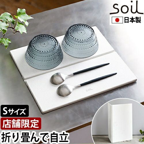 折り畳み式で、広げると2倍の大きさになり、収納時はコンパクトな「soil GEM フォルダブルボード S」。自然素材の珪藻土とひる石を使用し、優れた吸水性と速乾性でサラッと快適。薄く軽いのに割れにくい強度が特徴です。使う場所を選ばず、洗面所でうがいコップ置き場、キッチンで水切りプレート、玄関で雨に濡れた小物置きにも◎。あなたの全てのスペースで活躍します。