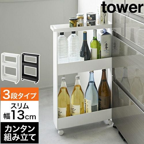 幅わずか13cmのキッチンワゴン、「tower キャスター付きスリムワゴン 3段」。コンパクトなので冷蔵庫横・カウンター横にすっきり収まり、隙間収納が叶います。3段仕様で、細くても収納力は抜群!小さな調味料はもちろん、ペットボトルや一升瓶も省スペースに収まります。キャスター付きなので移動がしやすく掃除のときも楽ちん。重い物もしっかり支える丈夫なスチール製です。