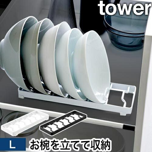 食器棚の中でかさばる大きなお椀をスッキリ収納できるディッシュスタンド「tower お椀スタンド L」。どんぶりやサラダボウルなどをスチール製のラックに立てて収納。立てて収納することで、今日使いたいお皿をサッと取り出せます。お椀を最大6個収納可能。省スペース設計で、引き出しや戸棚にもスッキリ収まります!底面にはクッション付きで、棚を傷つけにくい仕様です。