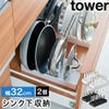 鍋やフライパンの収納に困った時におすすめのフライパンスタンド「tower シンク下幅調節鍋蓋&フライパン収納スタンド」!可動式仕切りバーで、お手持ちの調理器具をピタッと収納できます。シリコーン製クッションがフライパンを支え、取っ手も自立。シンク下はもちろん、食器棚の食器スタンドとしても活躍します。コンパクトに納まり、見た目もおしゃれ!