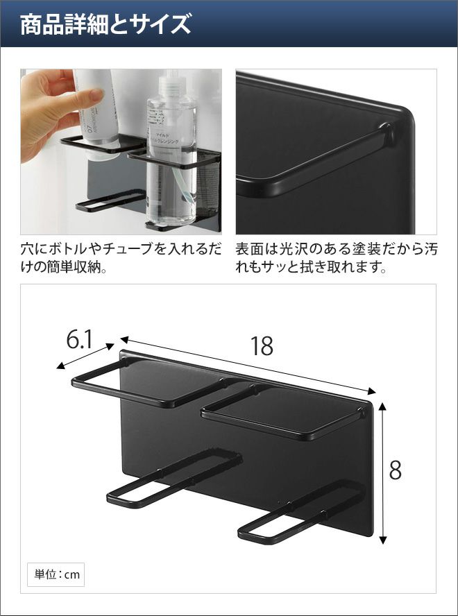 他の画像を見る 山崎実業/ボトルホルダー/マグネットラック/ディスペンサー/マグネット/壁/壁掛け/浮かせる/洗顔/浴室収納/浮かせる収納/壁面収納/浴室/バスルーム/お風呂/収納/yamazaki/タワーシリーズ/白/ホワイト/黒/ブラック 山崎実業 ボトルホルダー マグネットラック ディスペンサー マグネット 壁 壁掛け 浮かせる 洗顔 浴室収納 浮かせる収納 壁面収納 yamazaki タワーシリーズ [tower タワー マグネットバスルームチューブ&ボトルホルダー M ダブル 5506 5507 4903208055062 4903208055079] 当店特別価格 ¥ 1,870 税込 在庫切れ 詳細を見る お気に入りに登録する