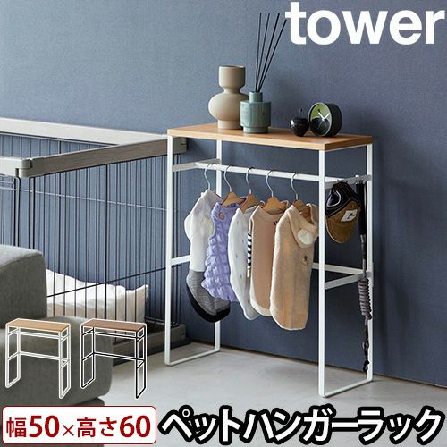 「tower(タワー) ペットコートハンガーラック」は、ペット用品の収納に困っている方、玄関にお散歩のグッズを収納した方におすすめのアイテム!W50×D21×H60cmのスリムな設計なので場所を選ばず、限られたスペースにも圧迫感なくスッキリと置くことができます。天然木の天板とマットなスチールの組み合わせがインテリアにスタイリッシュなアクセントをプラスしてくれます。