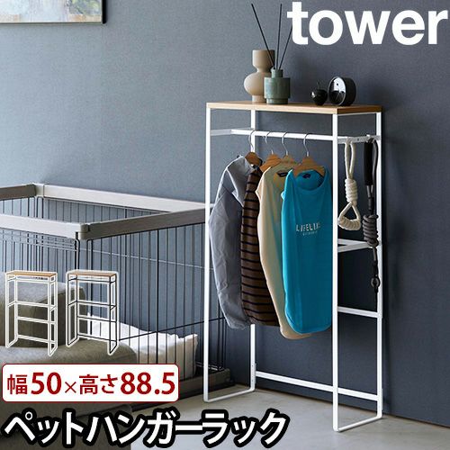 「tower(タワー) ペットコートハンガーラック トール」は、ペット用品の収納に困っている方、玄関にお散歩のグッズを収納した方におすすめのアイテム!W50×D21×H88.5cmのスリムな設計なので場所を選ばず、限られたスペースにも圧迫感なくスッキリと置くことができます。天然木の天板とマットなスチールの組み合わせがスタイリッシュです。