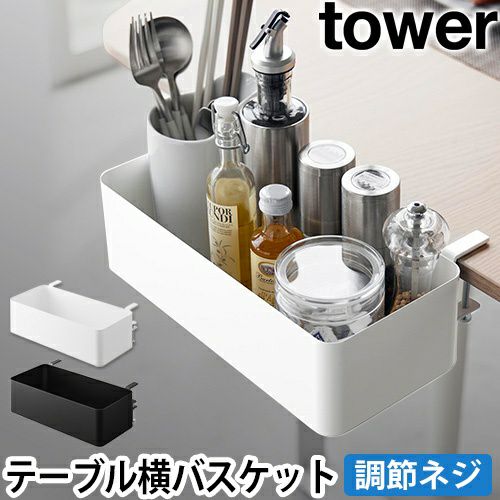 卓上に置いてある調味料ボトル、カトラリーなど細々とした小物の整理整頓にお役立ちのおしゃれな「tower テーブル横バスケット」。調節ネジでテーブルやデスクの横に簡単取り付け。中身が見えるので取り出しやすく、テーブルを拭いたり、食事をするときにスペースを広く使えます!リビングや書斎のデスクにある文房具やタブレット、ゲーム機などの小物収納にも便利です。