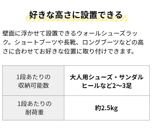 他の画像を見る ショートブーツや長靴・ロングブーツの高さに合わせて設置可能な壁面に設置できるシューズラック。浮かせるから掃除がしやすく、小物をかけるフックがついています。 山崎実業 シューズラック 石こうボード壁対応ウォールシューズラック タワー 2段 4504 4505 靴箱 下駄箱 靴入れ 2段 壁掛け 浮かせる コンパクト スリム 省スペース tower 壁面収納 浮かせる収納 靴収納 シューズ収納 yamazaki タワーシリーズ 当店特別価格 ¥ 2,750 税込 在庫切れ 詳細を見る お気に入りに登録する